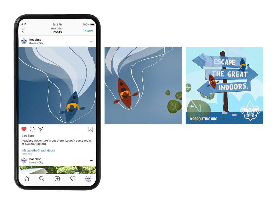 This recruitment campaign aims to raise decreasing membership numbers in Scouting amidst a pandemic. Aligning with the Boy Scouts’ national campaign message, “Escape the Great Indoors,” we created custom illustrations and a short animation video to feature the fun, outdoor activities you get to experience as a Scout. Then, took that creative and pushed out a paid social campaign that speaks directly to parents with Cub Scout-age children (5 to10 years old) who are climbing the walls at home. Join Scouting….adventure is out there!